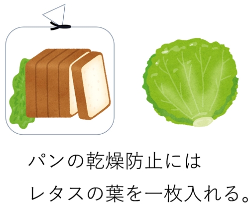 冷蔵庫に入れた食パンの、乾燥を防ぐには、食パンの袋の中に、レタスの葉を一枚入れることで、パンの水分を保つことが出来ます。