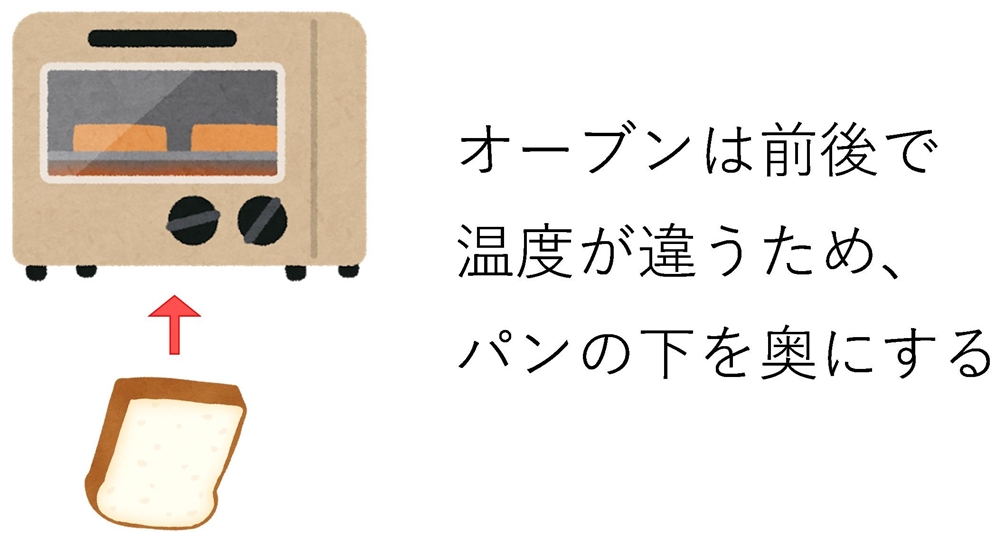 食パン表面の密度で、上下を判断して、下の方をオーブントースターの奥に入れて焼くと、焼きムラがほとんどできなくなります。