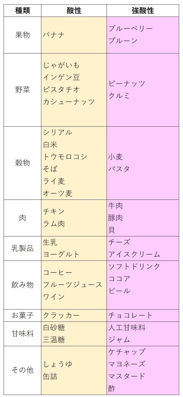 間食をするなら、なるべく気を付けた方が良い食べ物は、強酸性食品になりますので、下の表を参考にしながら、間食する飲食物に気を付けてください。