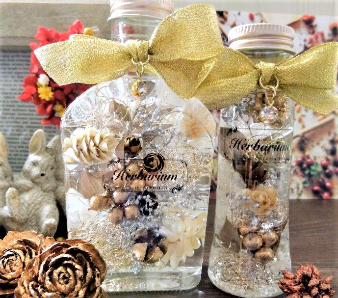 ハーバリウムは、ライトに透かすと、ビン全体がキラキラ輝いて、見るだけで日々の疲れが癒えてきますね。