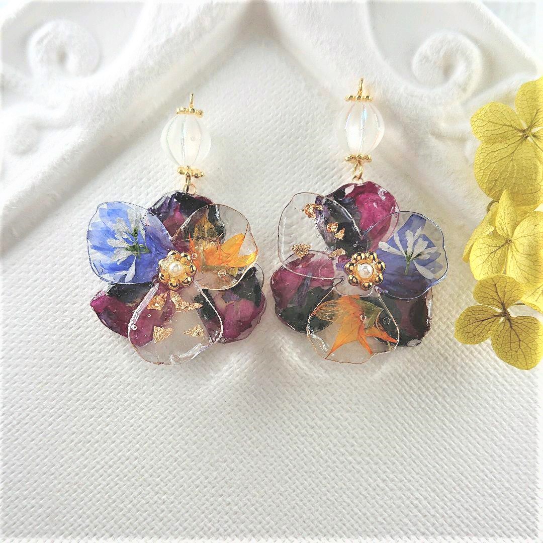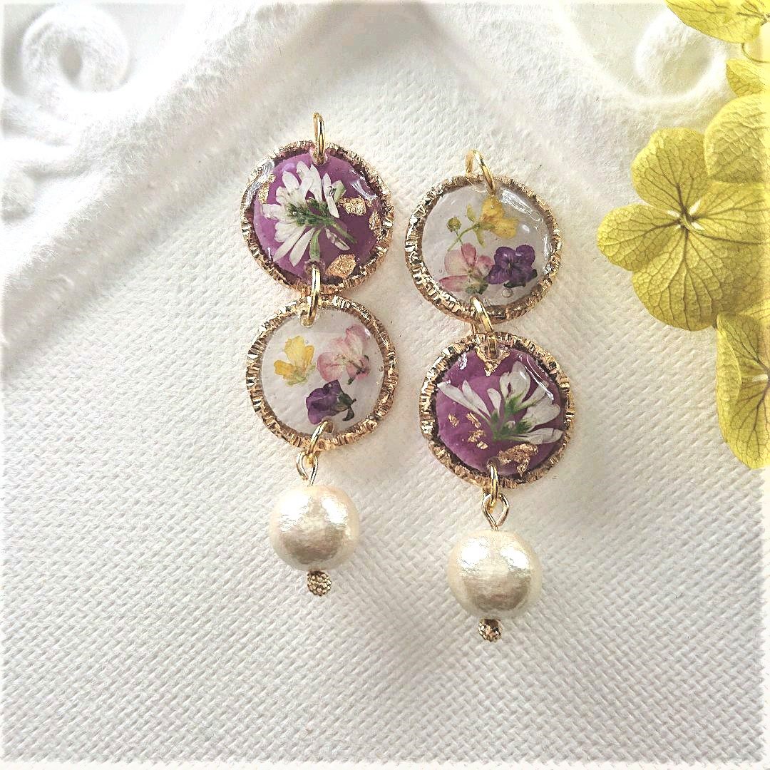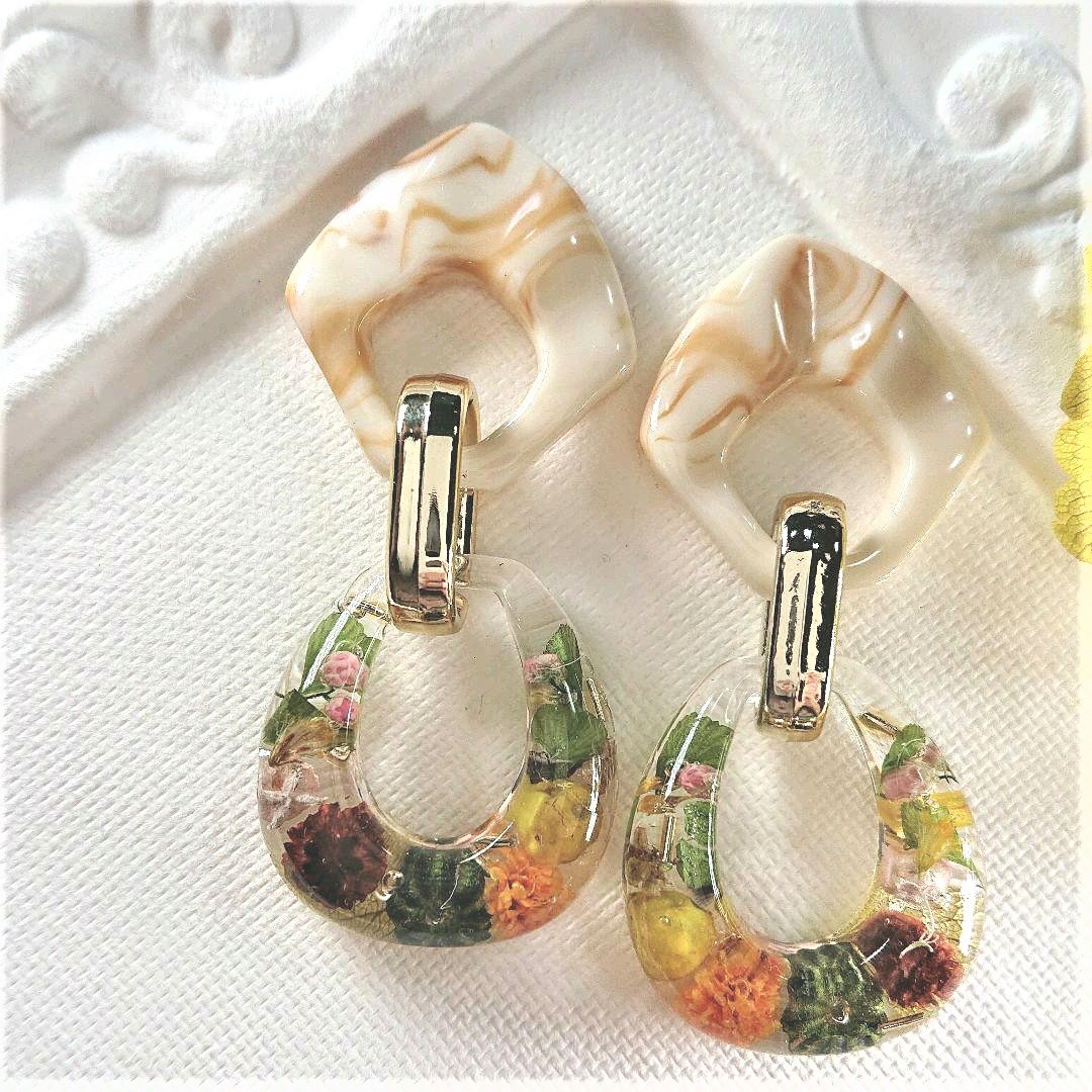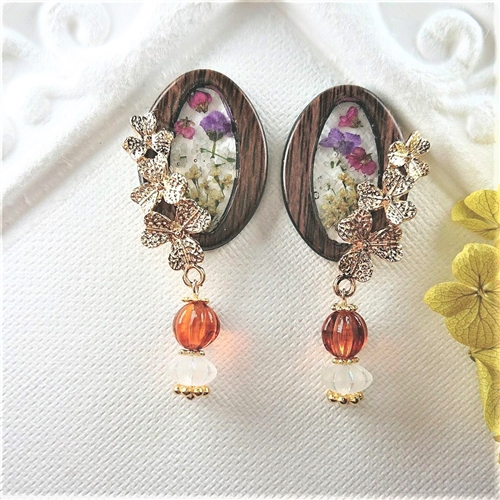 ピアスの飾りパーツの柄は、自然のお花が入っています