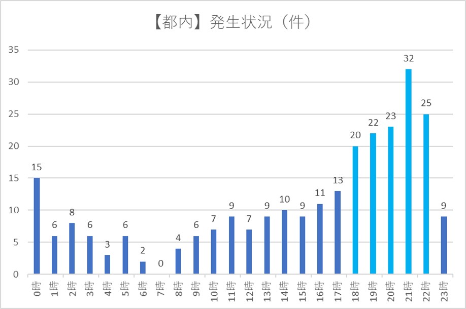ひったくり被害は、夕方から夜中にかけて、多く発生しています。