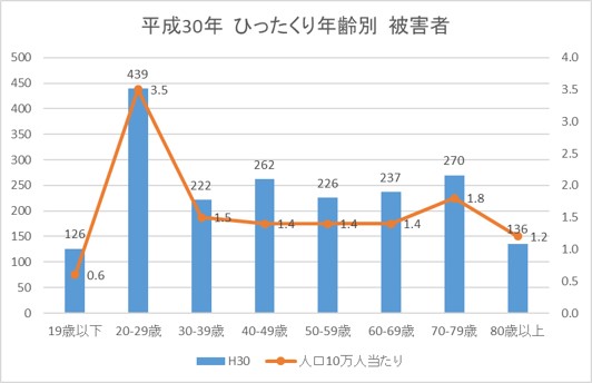 ひったくり被害者の7割が女性で、その中でも20代が最も被害にあっています。
