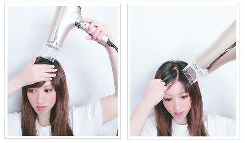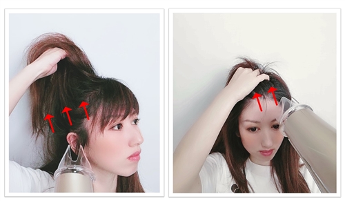 髪のボリュームが欲しい人は、髪を手でつかみ、ドライヤーは、下から上の方に向かって風を当てます。