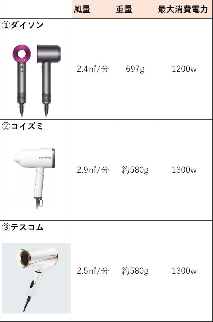 そこで風量の強い、ドライヤーを探したところ、テスコムの2.5m/分のドライヤーを発見して現在使用しています。