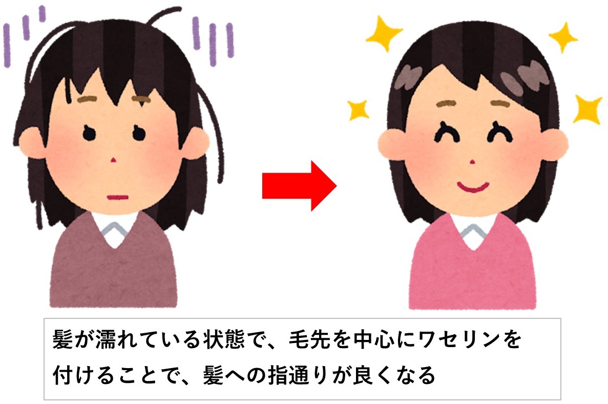 しかし、髪が濡れているうちに、毛先を中心に塗ることで、髪の内部の水分蒸発を防いだり、髪への指通りが良くなります。