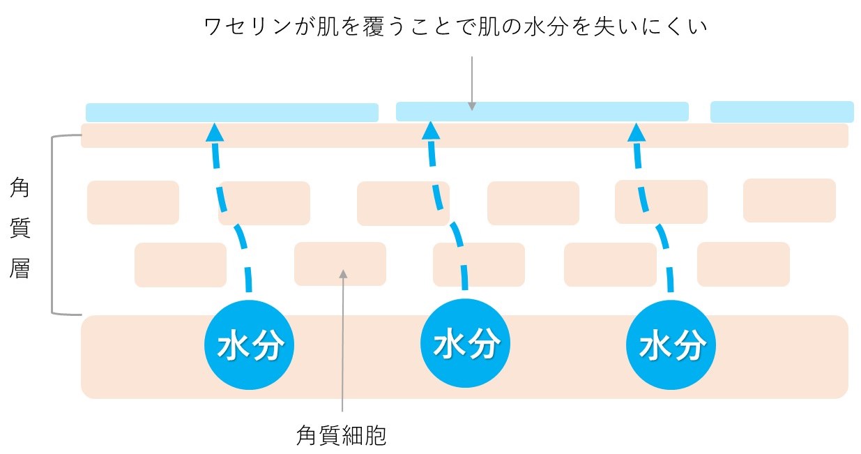 ワセリンは皮膚表面に膜を張り、角質層の水分の蒸発を防ぐことで、皮膚の乾燥を防ぐ効果がある。