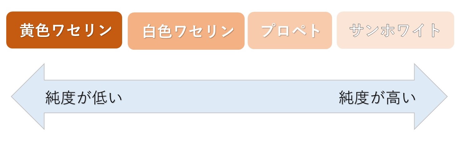 ワセリンの純度は、サンホワイトが一番高く、黄色ワセリンが純度が低い。