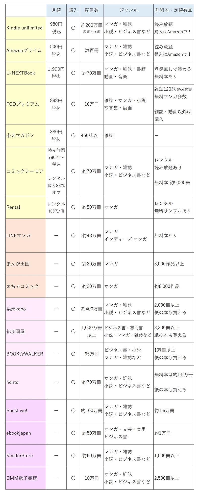 電子書籍を購入出来たり、定額で読み放題出来るサービスは、たくさんあります。