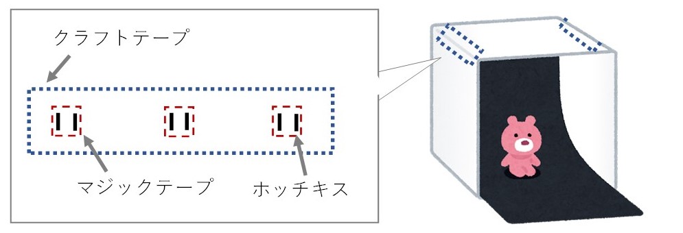 ・撮影ボックス上部の、クラフトテープに、マジックテープを付けておくと、組み立てた時、箱の形が安定します。