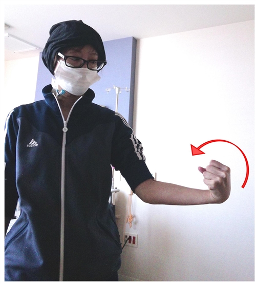 こぶしを握り締め、手首を内側に力を入れて曲げます。