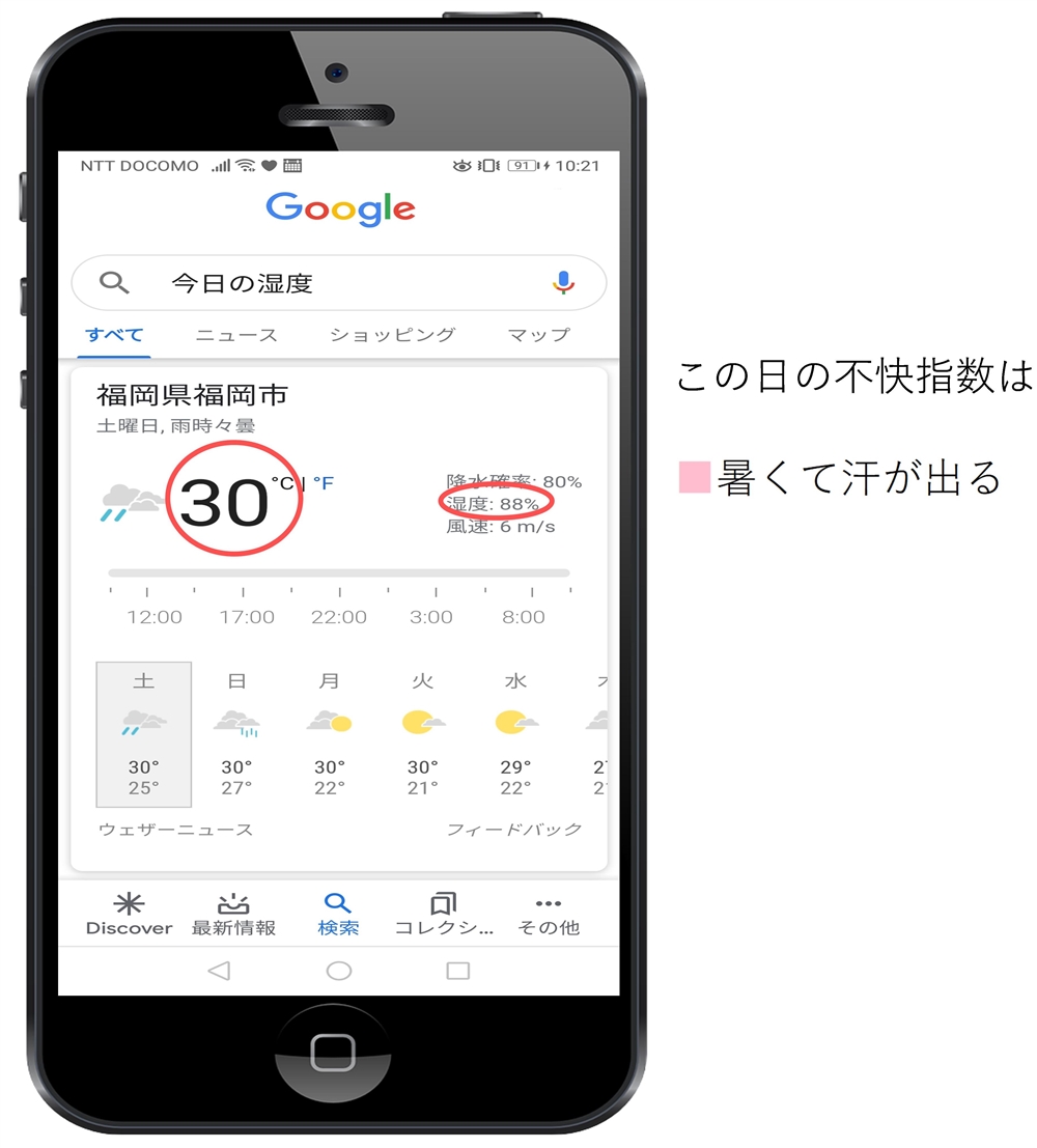 Googleの検索窓で「今日の湿度」と入力すると、現在地の気温と、湿度が分かります。