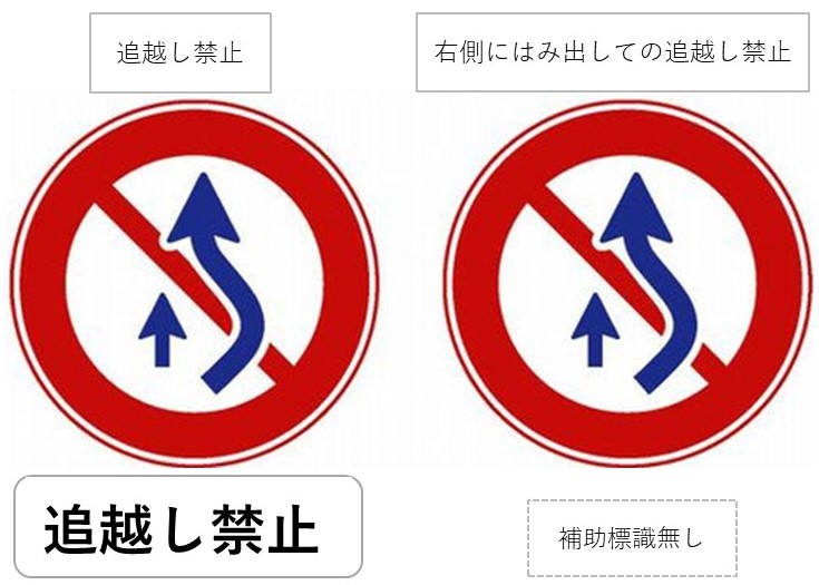 標識や補助標識で示されているとき、追越し・右側にはみ出しての追越しは禁止されています。