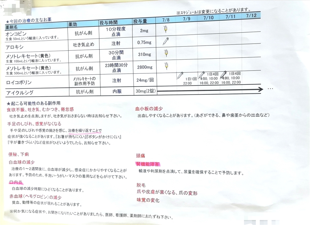 3回目も、地固め療法でしたが、2回目の入院で使う抗がん剤とは、違うものを使ったため、治療方法が全く違います。