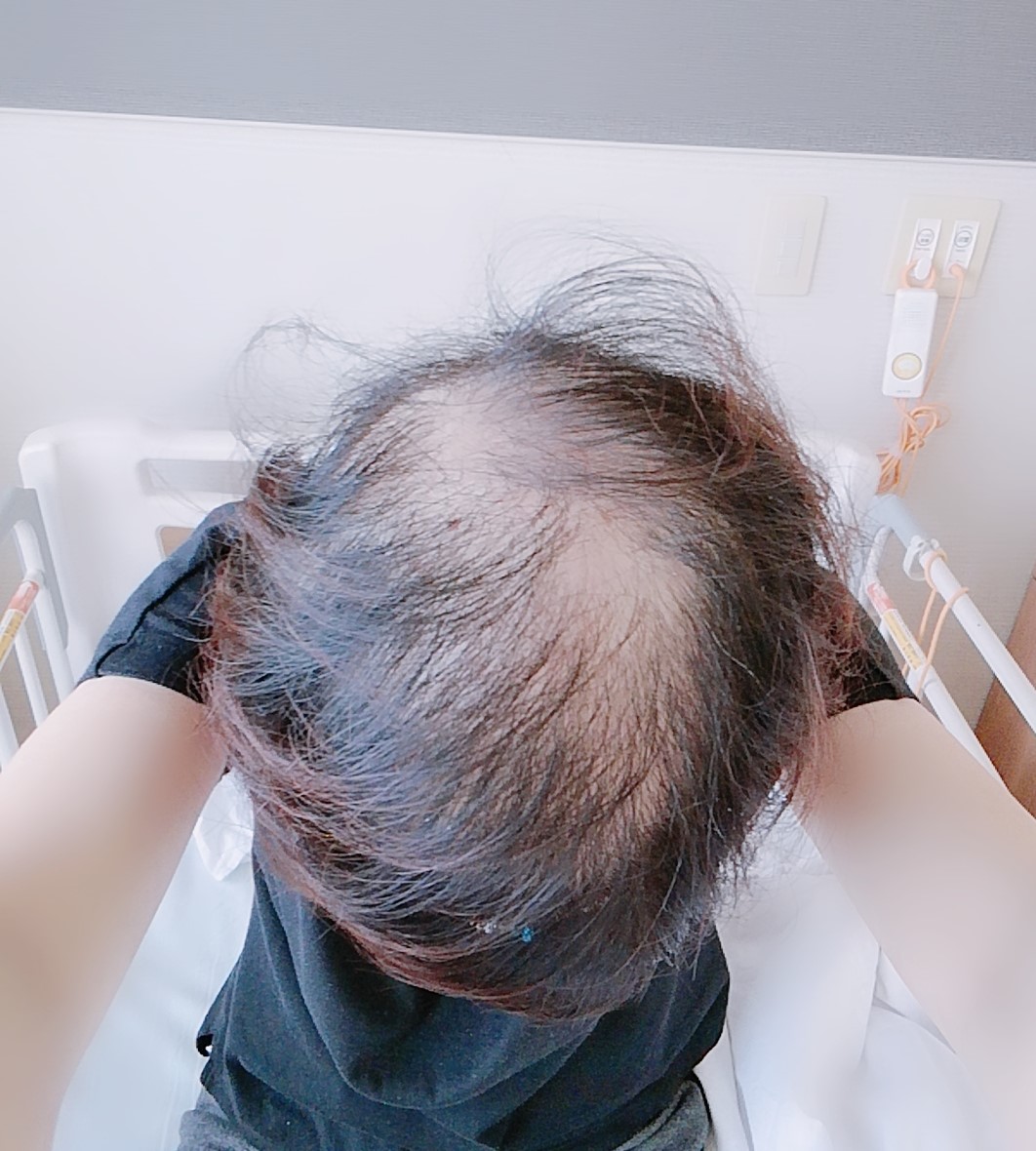 2回目の入院時の脱毛は、頭頂部の抜け毛がひどかったのですが、かろうじて、前から見ると、分からないくらいの抜け毛でした。