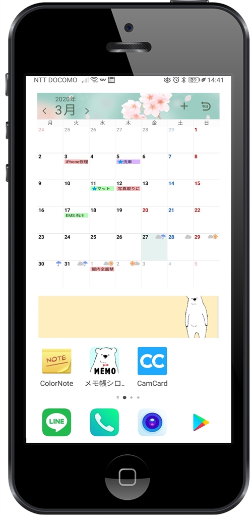 下の写真のように、スマートフォンの待ち受け画面に、カレンダーや付箋を貼っておくと便利です。