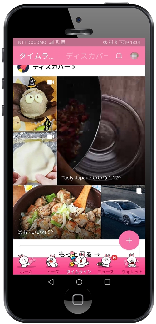 気が合う友達を探して、フォローする方法は、「タイムライン」の「ディスカバー」を開きます。