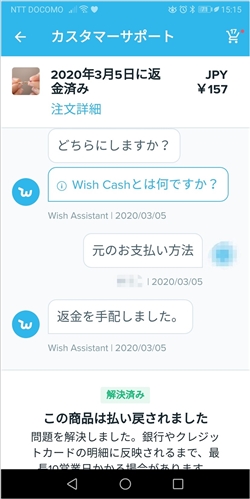 「Wish」内で使える、「Wish cash」または、クレジット・ペイパルで支払いをしていたならクレジット・ペイパルで返金されます。