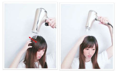 髪のボリュームが欲しい人は、髪を手でつかみ、ドライヤーは、下から上の方に向かって風を当てます。