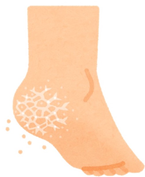 肌の乾燥が酷くなると、かかとのひび割れや、足全体が粉をふいたり、痒みが生じます。