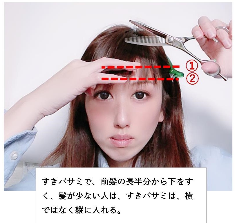 前髪全体を、自然に見せるために、「すきバサミ」を前髪半分より下に入れる。