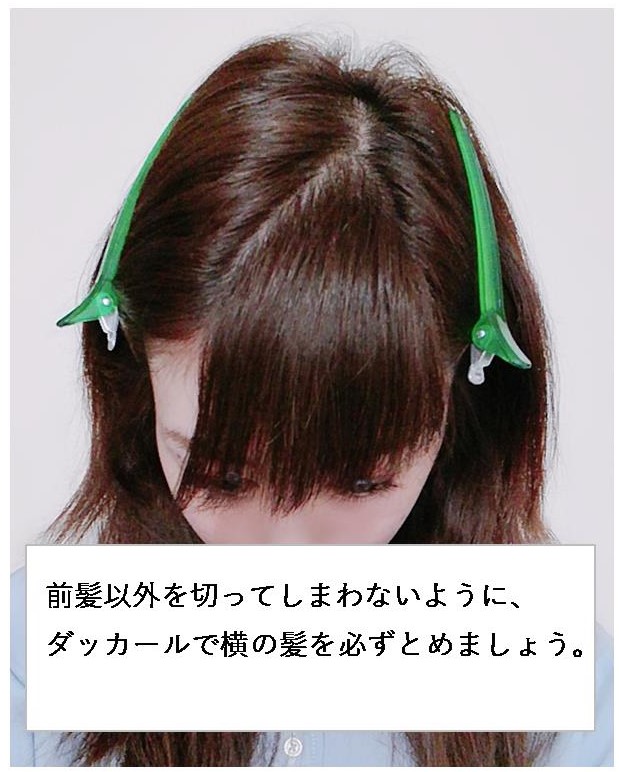 前髪を切る時は、横の髪を切ってしまわないように、ダッカールで必ずとめましょう。
