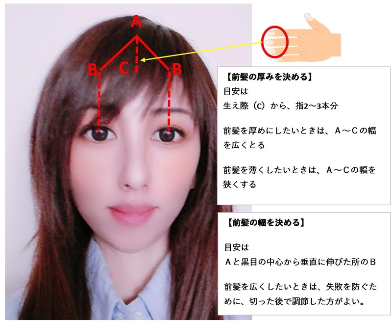 前髪を横髪と一緒に伸ばしていて、新たに、前髪を作る場合は、目安を参考にしてください。