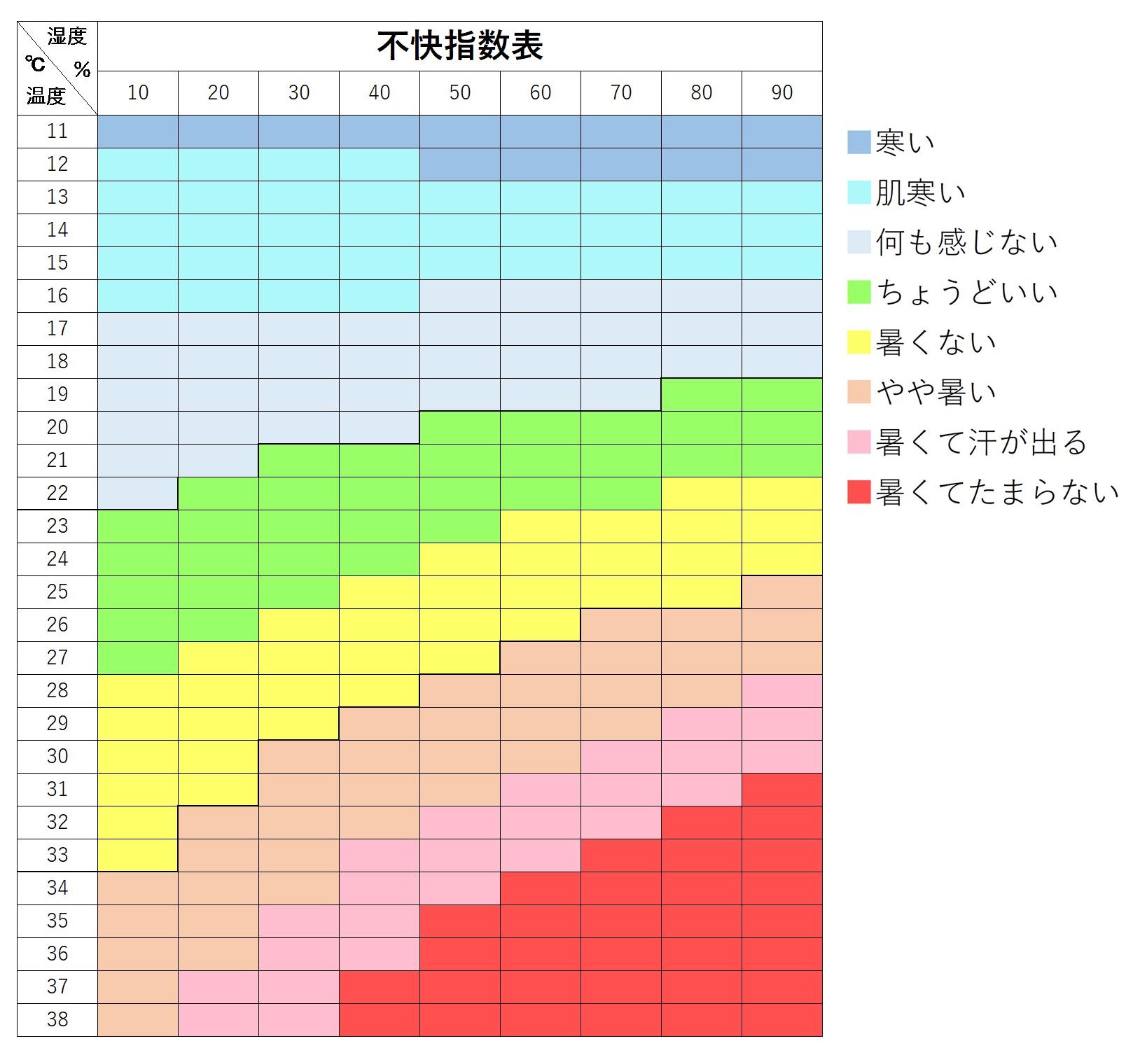 下の表を参考にし、自身の丁度いい温度と湿度を把握し、その時に合った服装や、暑さ対策をするようにしましょう。