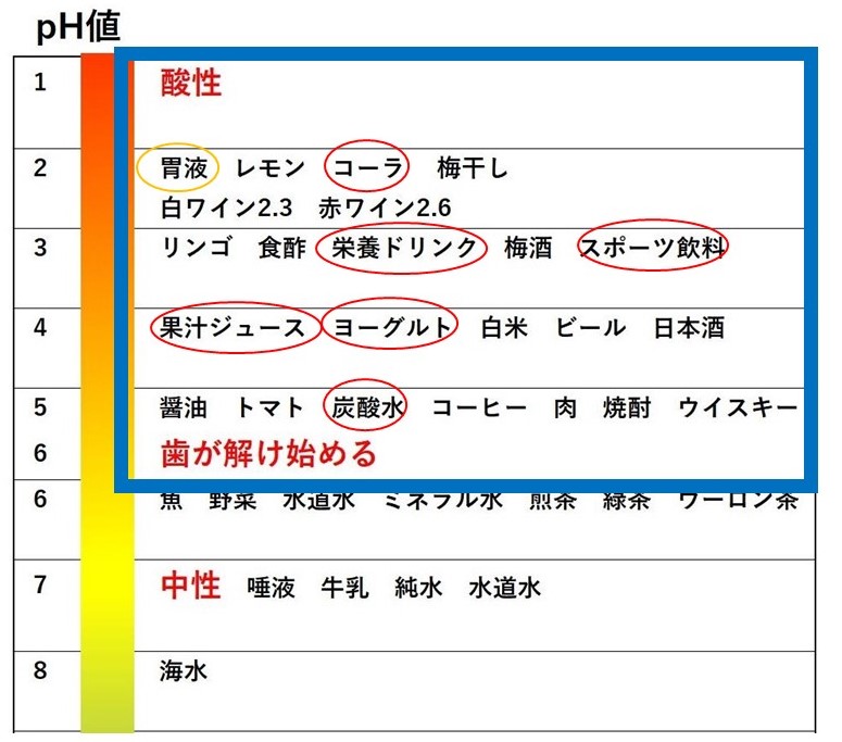 上の表の青い枠で囲った部分は、歯が溶けやすい飲食物です。酸性が強いほど溶けやすくなります。