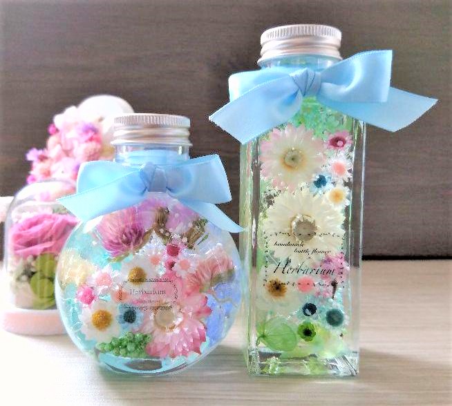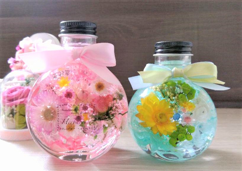 ハーバリウムは、ライトに透かすと、ビン全体がキラキラ輝いて、見るだけで日々の疲れが癒えてきますね。