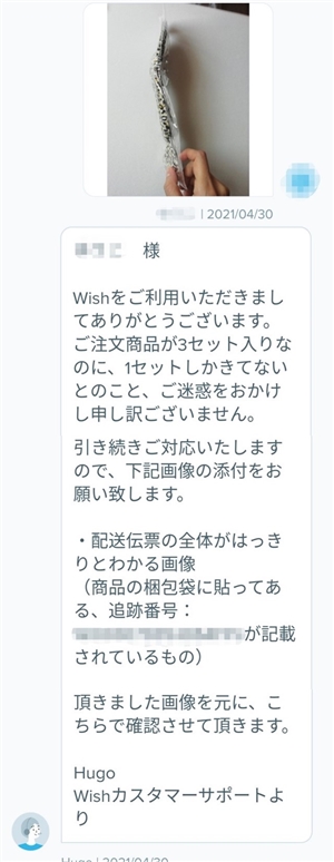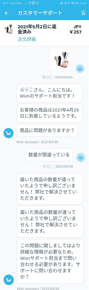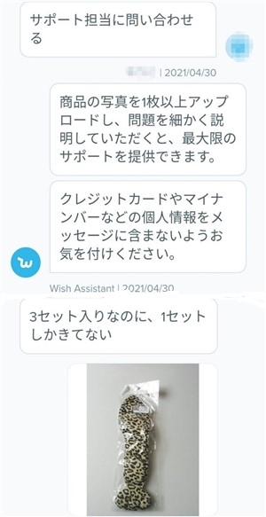 間違った商品の場合、「Wish」のカスタマーサポートに連絡すれば、写真付きで説明すれば、公平に判断してくれます。